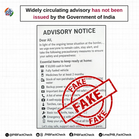 New Delhi, May 7 (IANS) In the wake of the Indian armed forces’ successful ‘Operation Sindoor’, which targeted nine high-value terror sites in Pakistan and Pakistan-occupied Kashmir (PoK), the government’s official fact-checking agency has flagged a fabricated advisory falsely attributed to the Centre.