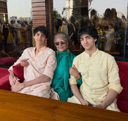 Pinkie took to Instagram, where she posed for a picture with her grandsons Hridaan and Hrehaan at the actor Eshaan Roshan’s pre-wedding ceremony.