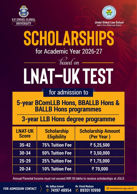LNAT-UK scores will be considered for merit-cum means-based scholarships. Scholarships are awarded in the range of 10 per cent, 25 per cent, 50 per cent, and 75 per cent of tuition fees, based on merit and annual parental income criteria.