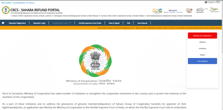 In compliance with the Supreme Court’s order, an Online Portal “CRCS-Sahara refund portal” https://mocrefund.crcs.gov.in was launched on July 18, 2023 for submission of claims by the genuine depositors of four Multi-State Cooperative Societies of Sahara Group, namely; Sahara Credit Cooperative Society Ltd., Lucknow, Saharayn Universal Multipurpose Society Ltd., Bhopal, Humara India Credit Cooperative Society Ltd., Kolkata, and Stars Multipurpose Cooperative Society Ltd., Hyderabad for refund of their legitimate deposits.