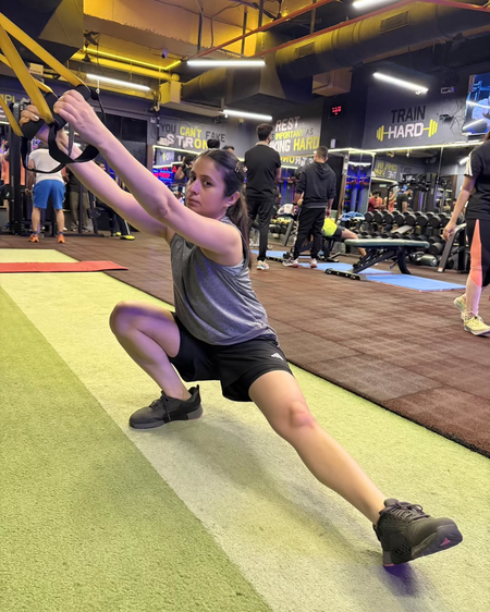 Rasika opted for black shorts and a gray tank top as part of her workout attire.