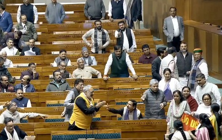 In the video, two or three ministers, including Ashwini Vaishnaw, Giriraj Singh and other MPs, are seen pleading and persuading the women lawmakers to go back to their seats and refrain from such unparliamentary behaviour, but the latter remained unrelenting and stood firm with banners and posters.