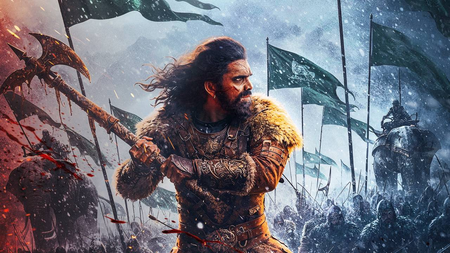 The first-look poster is a striking visual set against a storm-lashed, snow-covered battlefield. Rishabh appears in mid-charge, brandishing a giant, blood-soaked battle axe with fierce resolve.