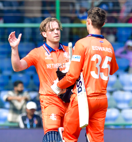 Fast-bowling all-rounder Bas de Leede was the standout performer, scoring an unbeaten 72 and taking two wickets to become the first Dutch player to achieve the double of a fifty and two wickets in a T20 World Cup match.