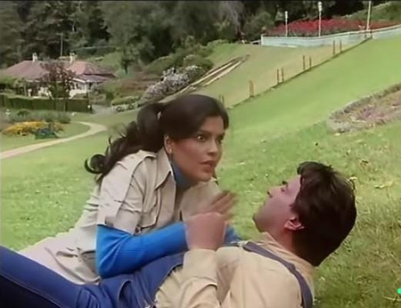 “Did things really change quite that radically for Hindi cinema heroines in the two short years that passed between the two films? It’s doubtful, but I do think this scene offers a nice gender flip on the usual trope. Here Dharmji’s Ashok is naive and imposed upon, while my Barkha is roguish and completely inappropriate! She aggressively pursues him, while he plays the reluctant and irritated object of her desire.”